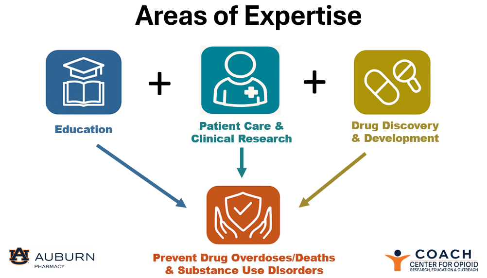 The Harrison College of Pharmacy (HCOP) and Auburn University’s leadership established the Center for Opioid Research, Education and Outreach, or COACH, after identifying the need and recognizing an opportunity to serve our local communities and the state of Alabama. The Center enables researchers to unify existing programs and expertise, providing a stronger response to the opioid epidemic. We utilize each area of the Center to address the health and well-being of those affected by opioids and substance use disorders.